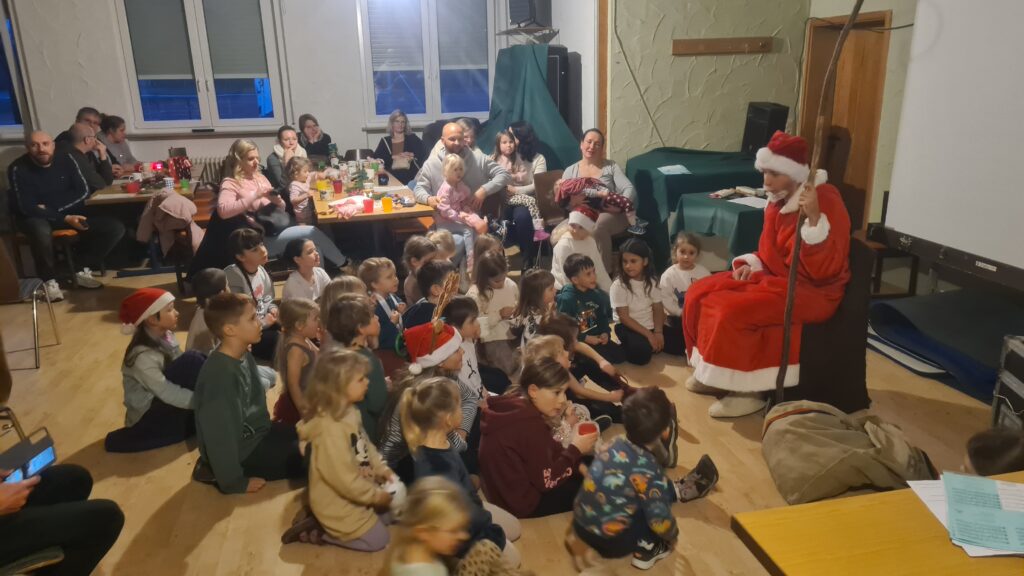Mit circa 35 Kindern, die in Begleitung ihrer Familie gekommen sind, war der Nebentraum zu unserem Erfreuen belebt und sogar überbelegt. Doch mit ein paar extra Stühlen fanden alle einen Platz.